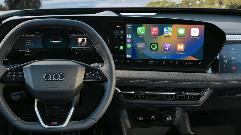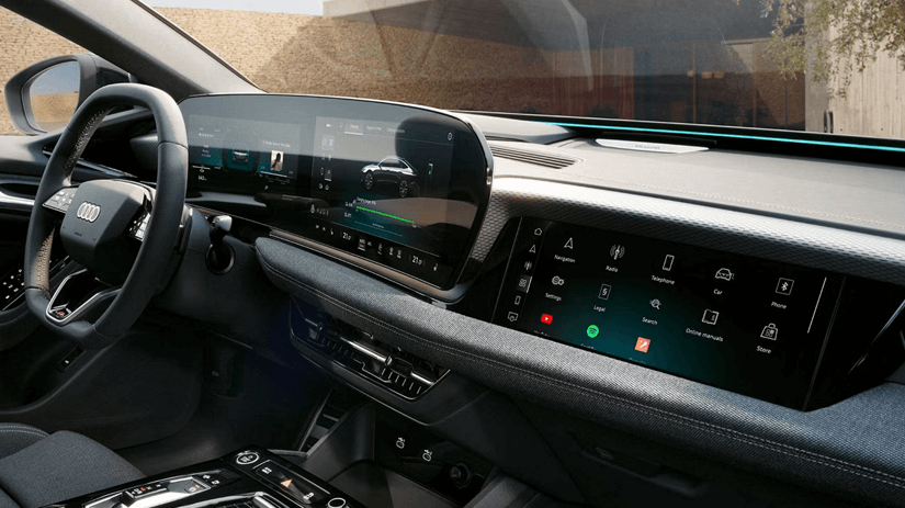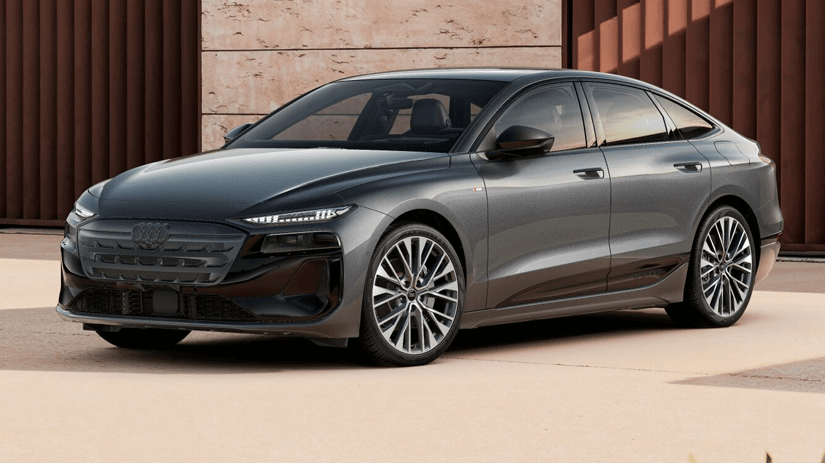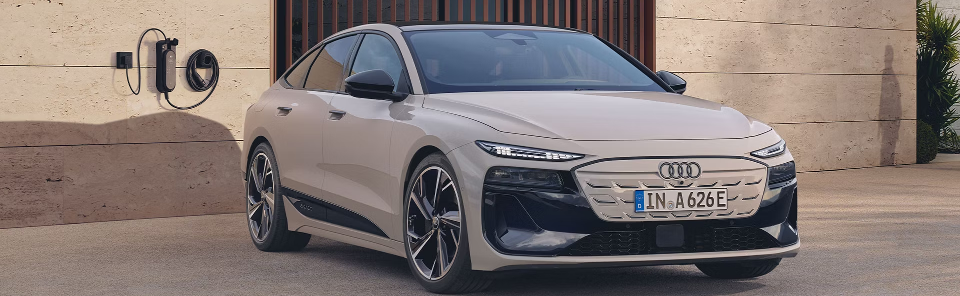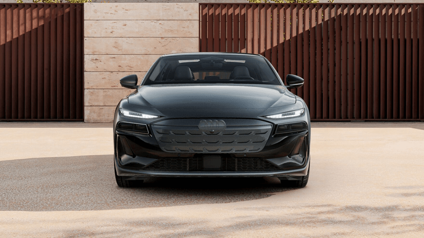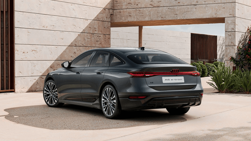 Traseira aerodinâmica: O design traseiro, enfaticamente largo, é caracterizado pela faixa de luz contínua com os anéis Audi iluminados acima. As proporções fortes e esportivas são sublinhadas pelo impressionante difusor traseiro.