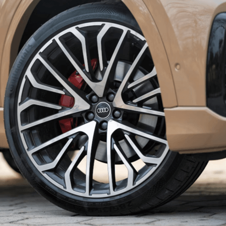 As impressionantes rodas de liga leve de 23 polegadas com o acabamento torneado brilhante contribuem para a estética progressiva do Audi Q8.
