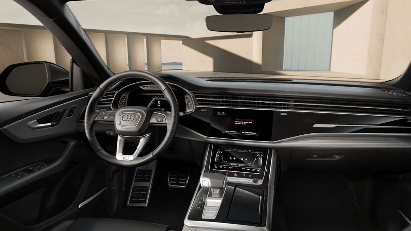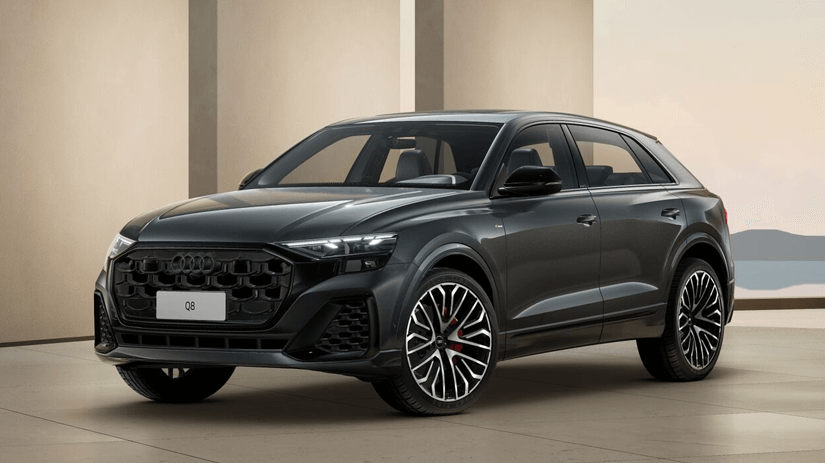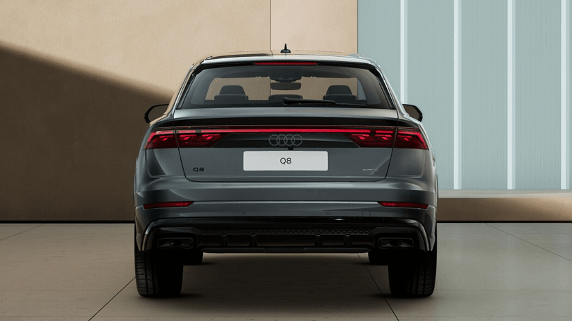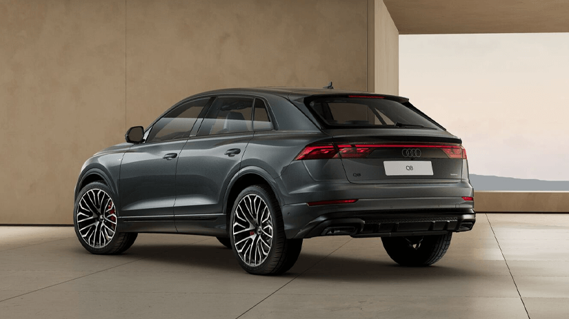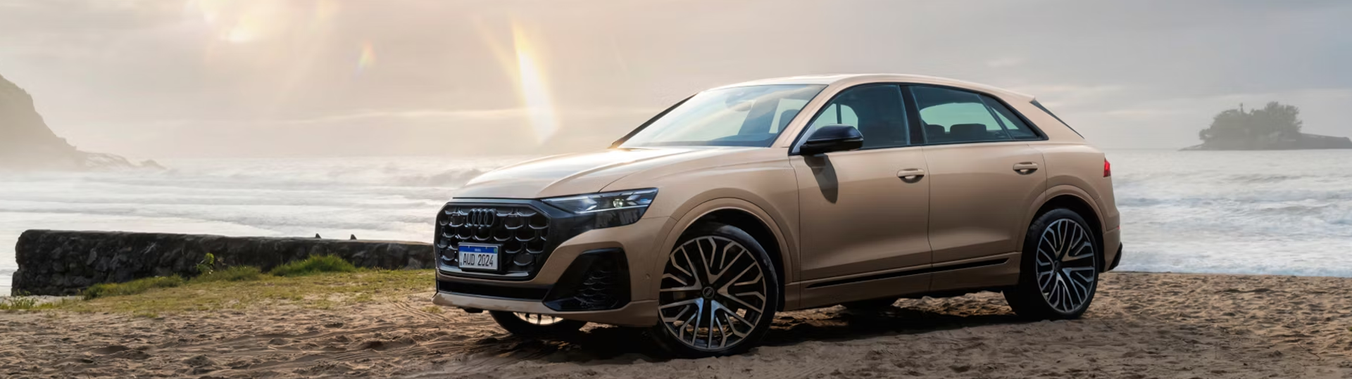 O novo Audi Q8 exibe seu DNA off-road com arquitetura quattro clássica e uma poderosa linha Coupè. Detalhes como o impressionante Audi Singleframe, os anéis Audi em aparência 2D e o pacote S line contribuem para tornar sua robustez e força ainda mais evidente.