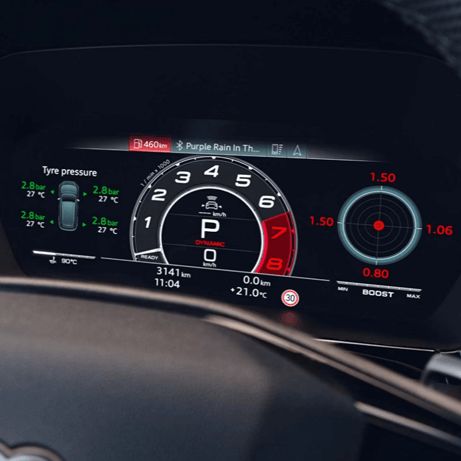 Desfrute de momentos esportivos com a exibição central das rotações do design do conta-giros no Audi virtual cockpit plus. O painel de instrumentos totalmente digital de 12,3 polegadas também oferece os mostradores de instrumentos nos modos "Sport", "Performance" e "Runway", além de mostrar as informações relevantes.