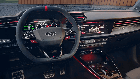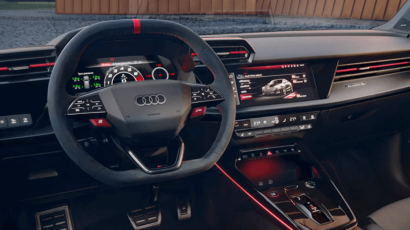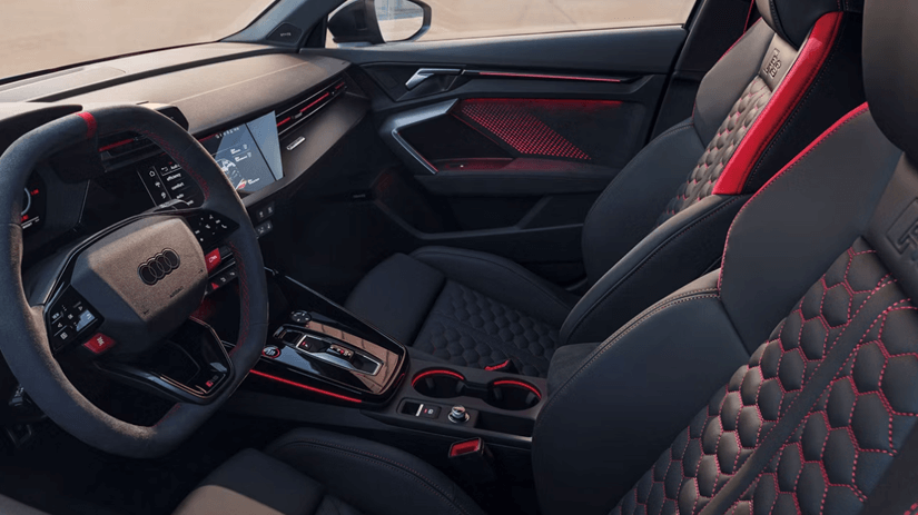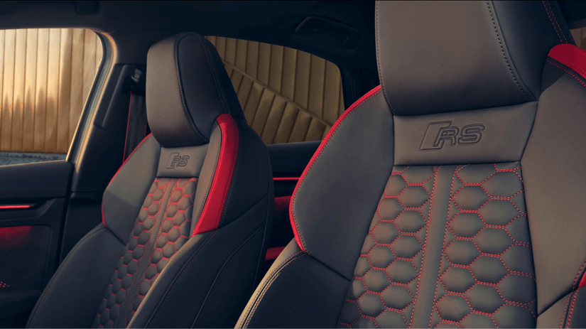 O interior exala esportividade com bancos dianteiros esportivos, volante esportivo achatado e contorno esportivo, elementos de design RS distintos e aplicações de alta qualidade.